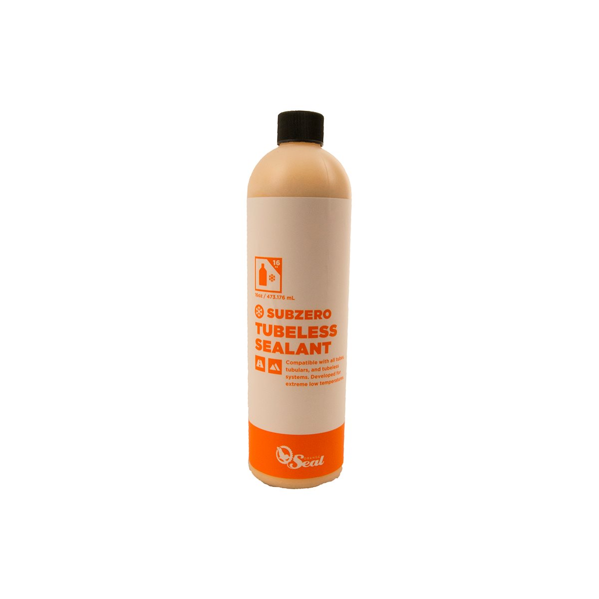 Orange Seal Subzero tubeless-tiiviste 437ml. Subzero -versio säilyttää tiivistyskykynsä -20°C asti. Brand: ORANGE SEAL Item name: Subzero - Tubeless sealant Volume: 437 ml